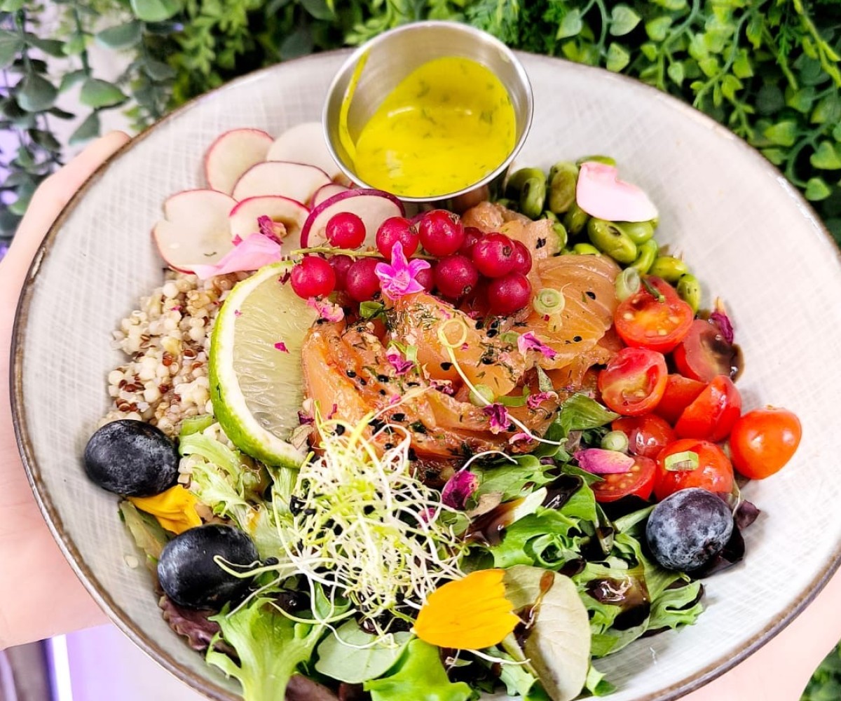 Fromage blanc, fruits frais, granola, noix de coco râpée, coulis au choix