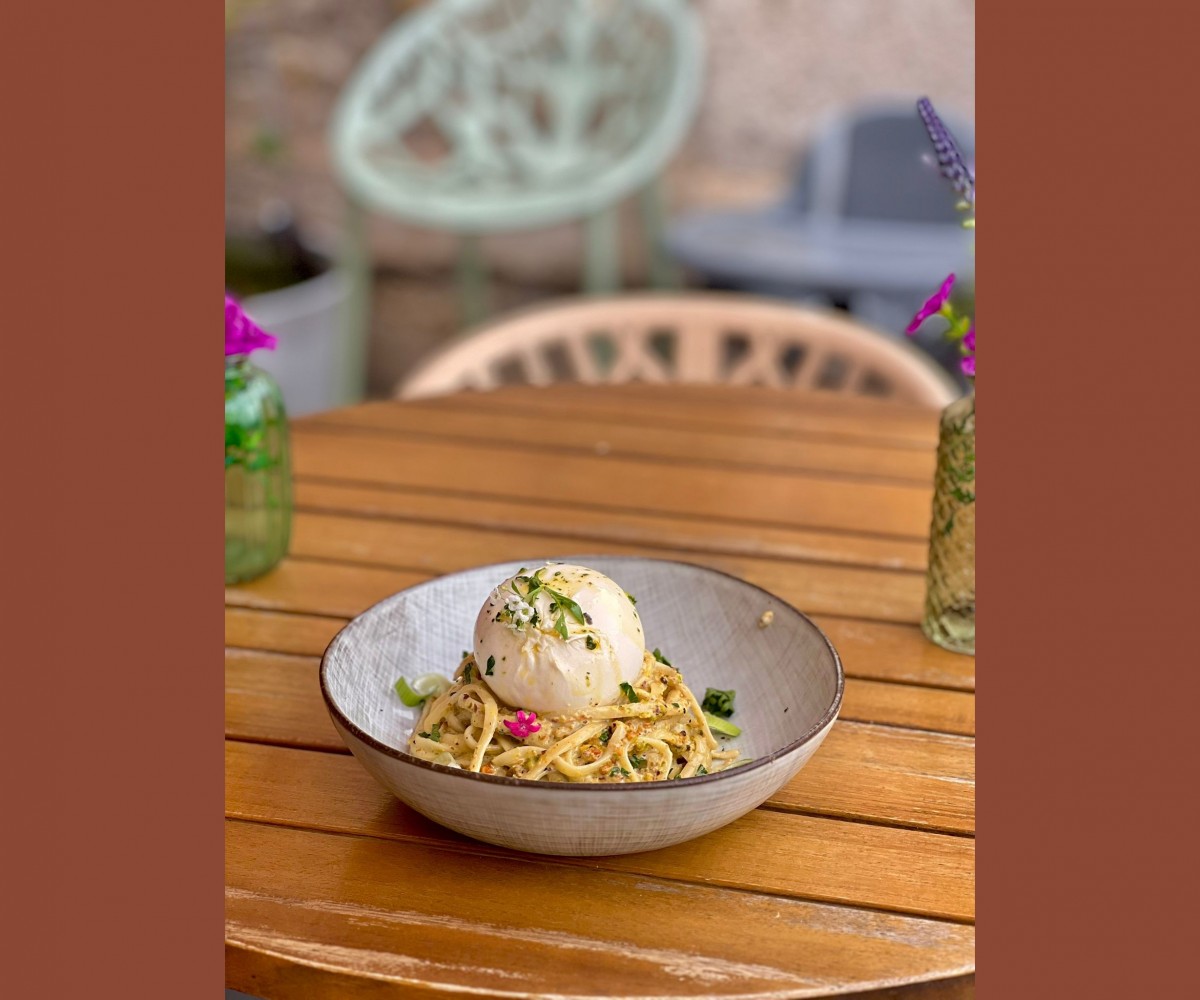 Linguines, burrata, crème de pistache, éclats de pistaches.