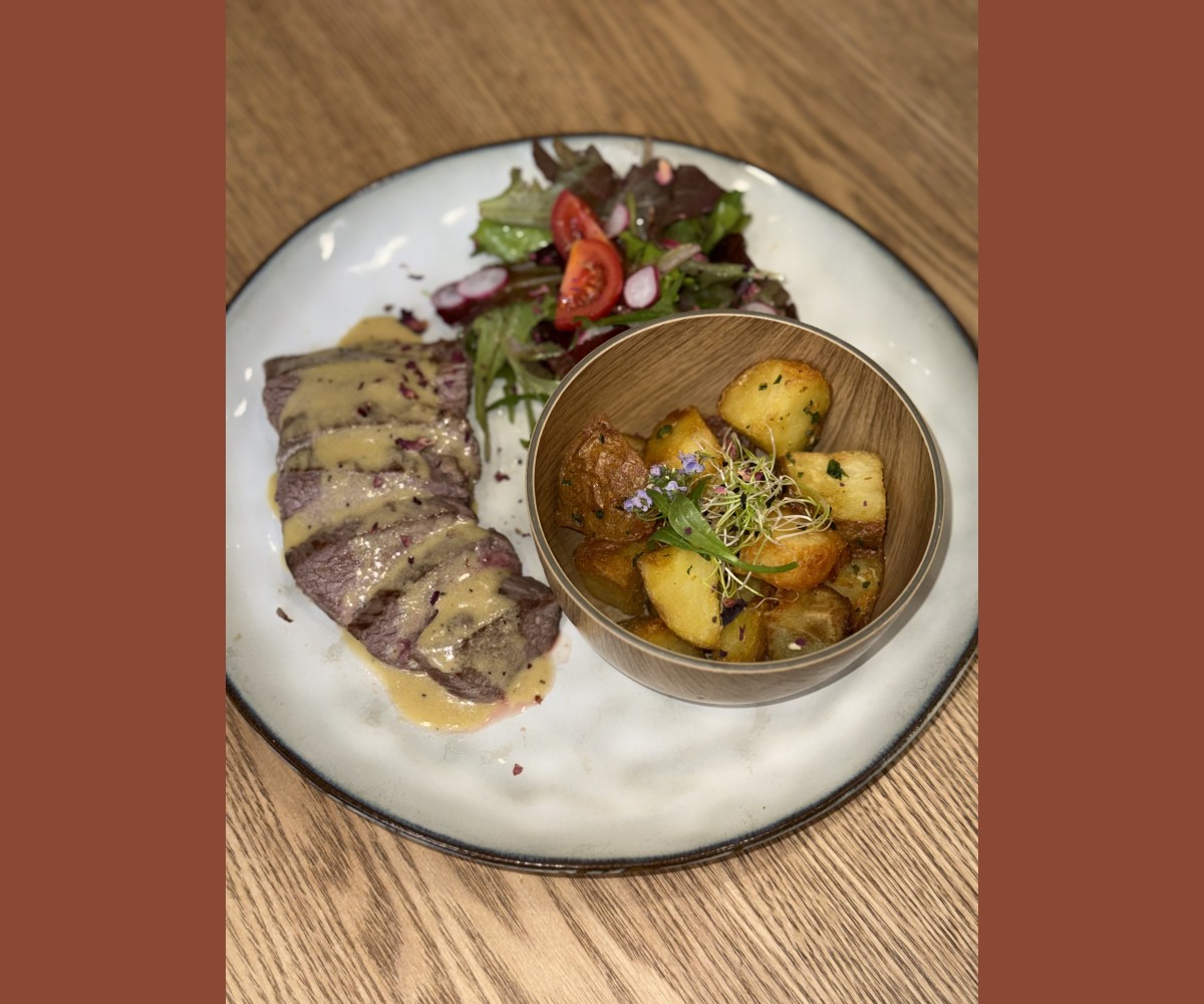 Bavette, purée de pommes de terre à la crème de truffe, sauce au poivre vert, mesclun.