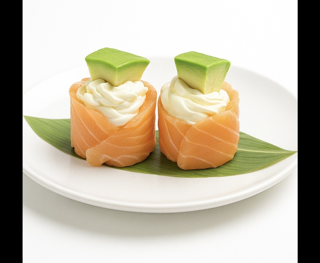 Rolls de riz garnis de cream cheese onctueuse et d’avocat fondant, sans feuille d’algue nori, pour une bouchée douce et savoureuse. ( 8 pièces)Allergènes : Crustacés, Poisson, Soja