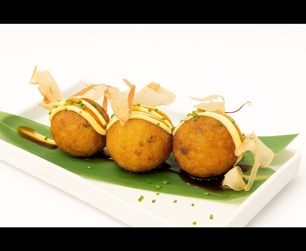 Boulettes fondantes de Poulpe, nappées de sauce teriyaki, bonite séchée et une touche de mayonnaise onctueuse. ( 3 pièces)Allergènes : Mollusques, Crustacés, Soja, Gluten