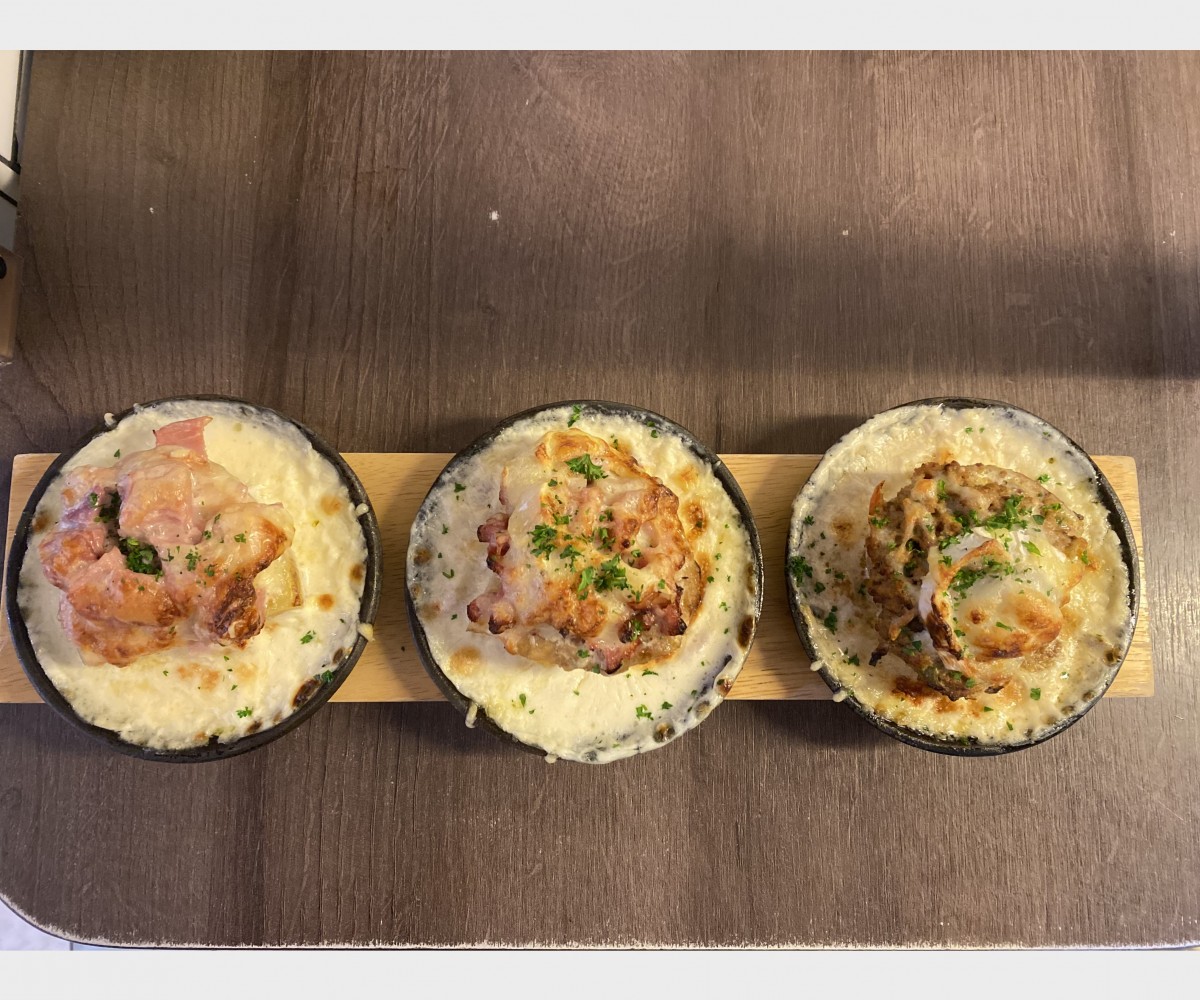 Notre oeuf cocotte est constitué de reblochon, morbier et chèvre