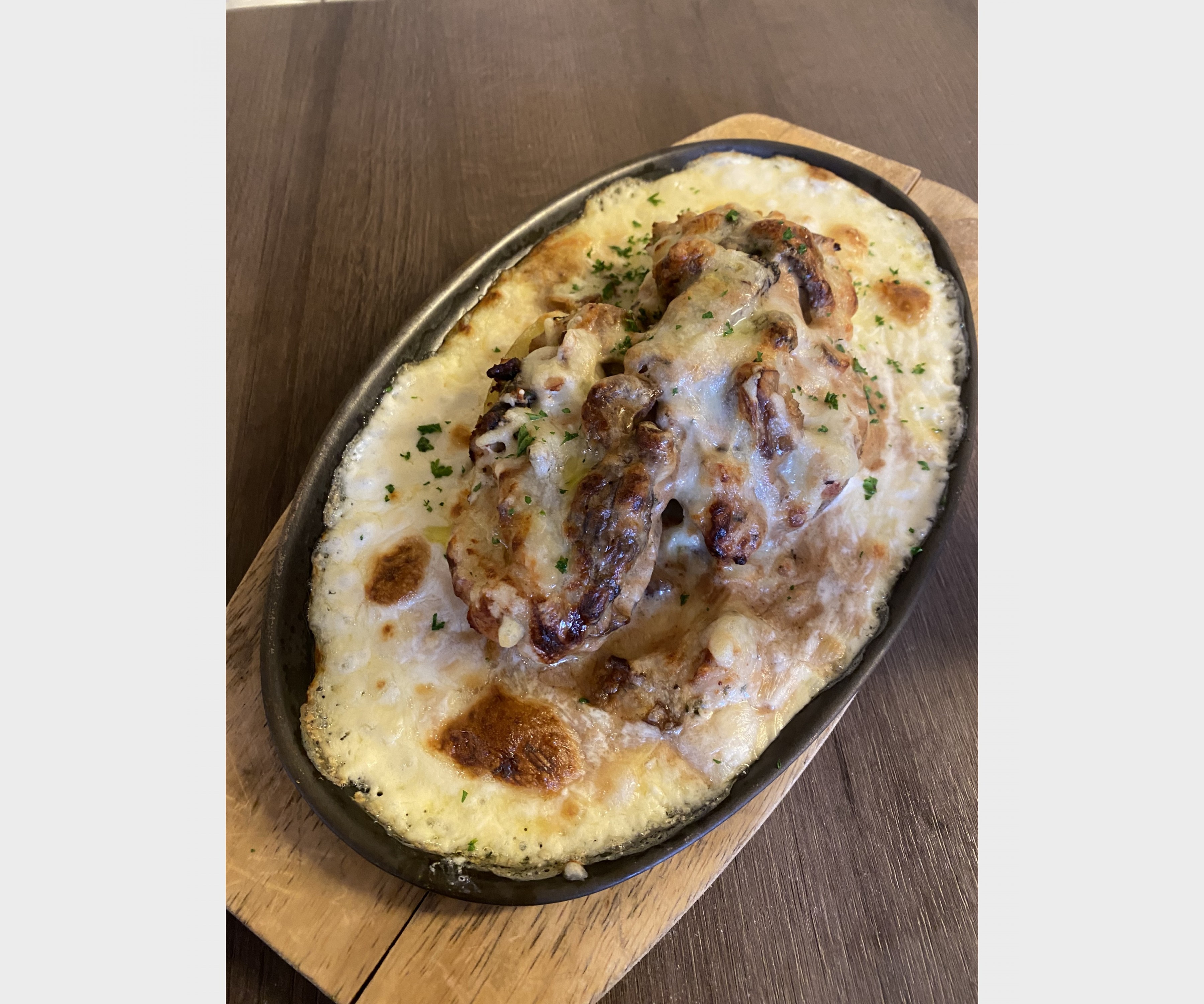 Pomme de terre au four, poulet, lardons fumés, ail, champignons de Paris, camembert, crème, fraîche et emmental : ce mélange de saveurs ne peut que vous donner satisfaction.