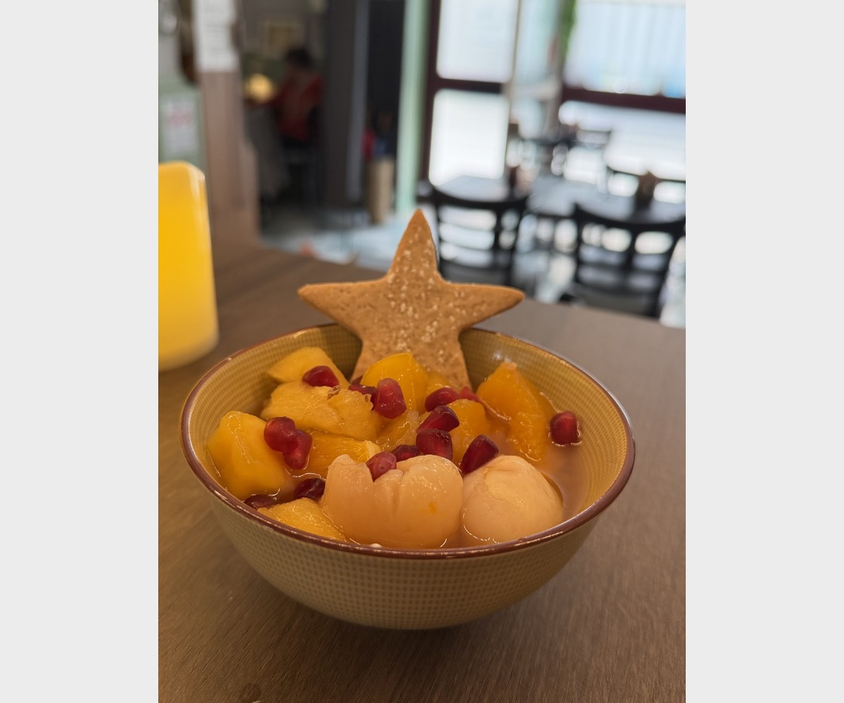 Salade de fruits variés ananas, mangue, orange, litchis.....infusion de sirop à la cannelle, badiane.