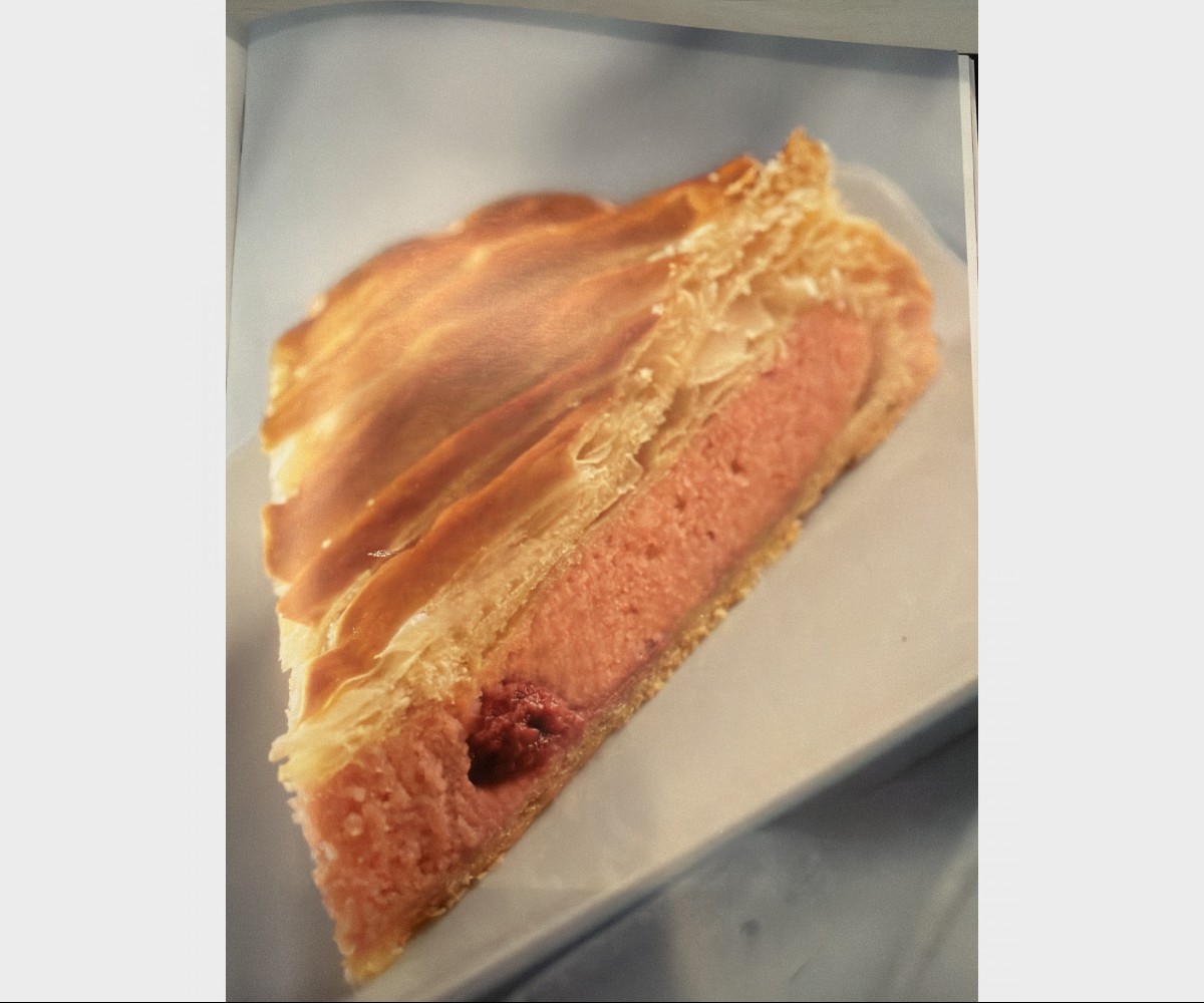 La galette des rois est composée de poudre d'amande, poudre rose, éclats de framboises