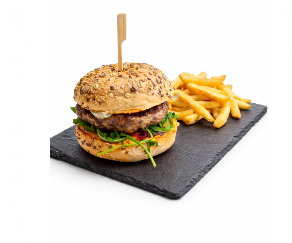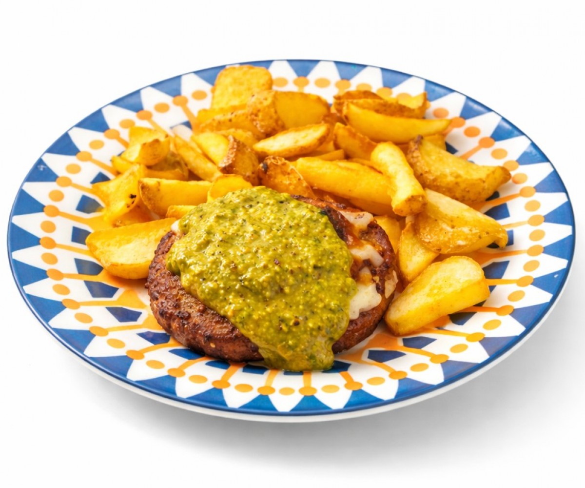 HAMBURGUESA DE BURRO, QUESO PRIMO SALE, PIMIENTOS ASADOS,PESTO DE ALBAHACA, PAPAS FRITAS, MAYONESA