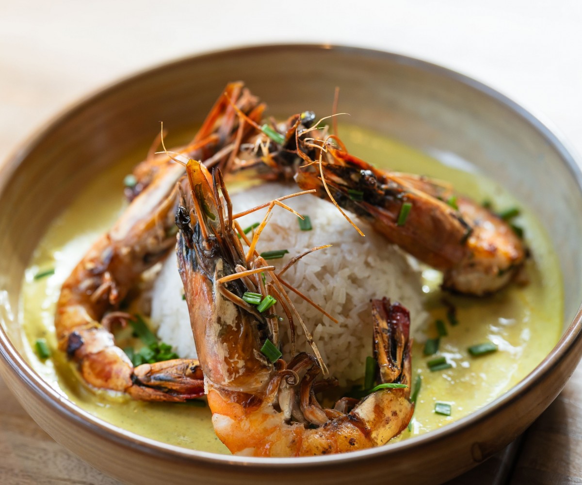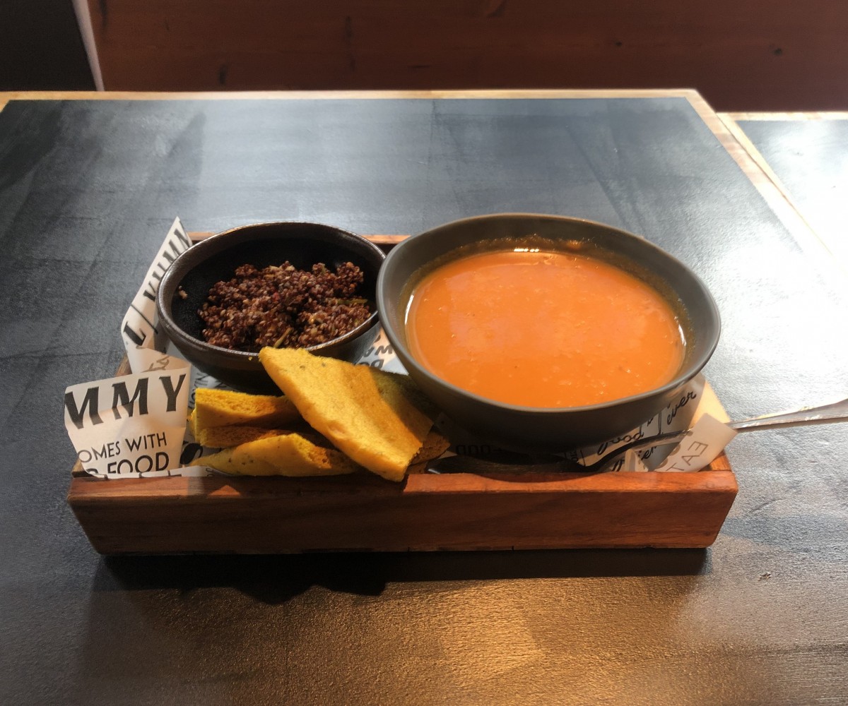 Coconut and curry sauce, pickled vegetables, cheddar cheese and spinach - turmeric bread / served with mango quinoa salad