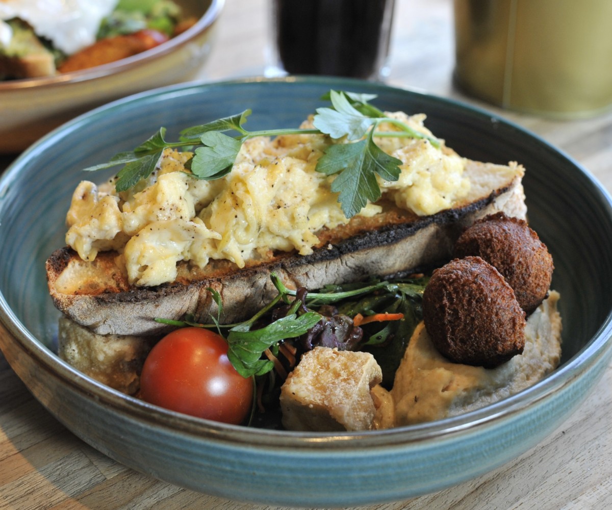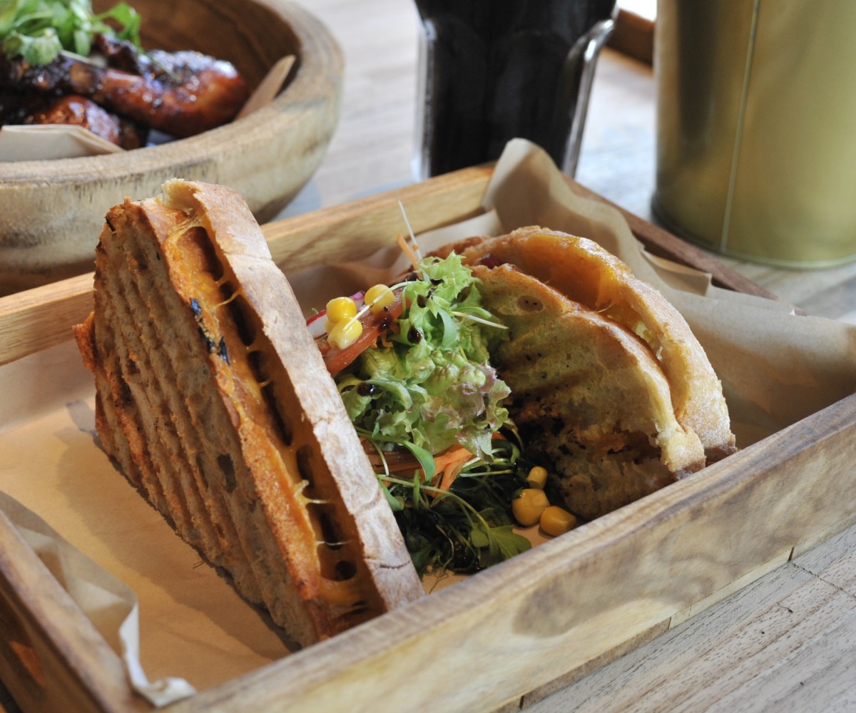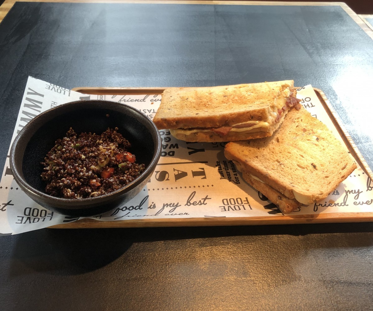 Yassa sauce, pickled vegetables, cheddar cheese and spinach - turmeric bread / served with mango quinoa salad