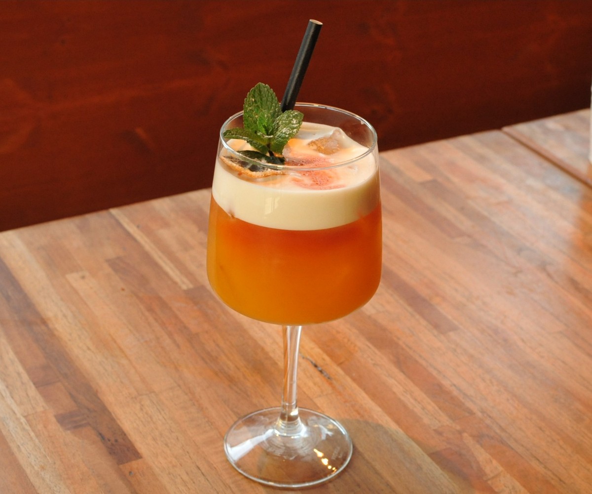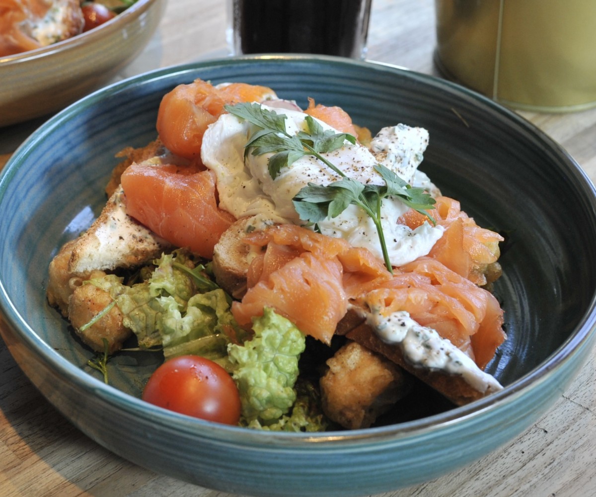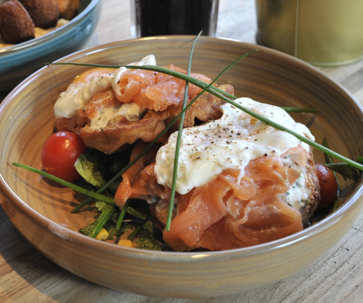 Yassa sauce, pickled vegetables, cheddar cheese and spinach - turmeric bread / served with mango quinoa salad