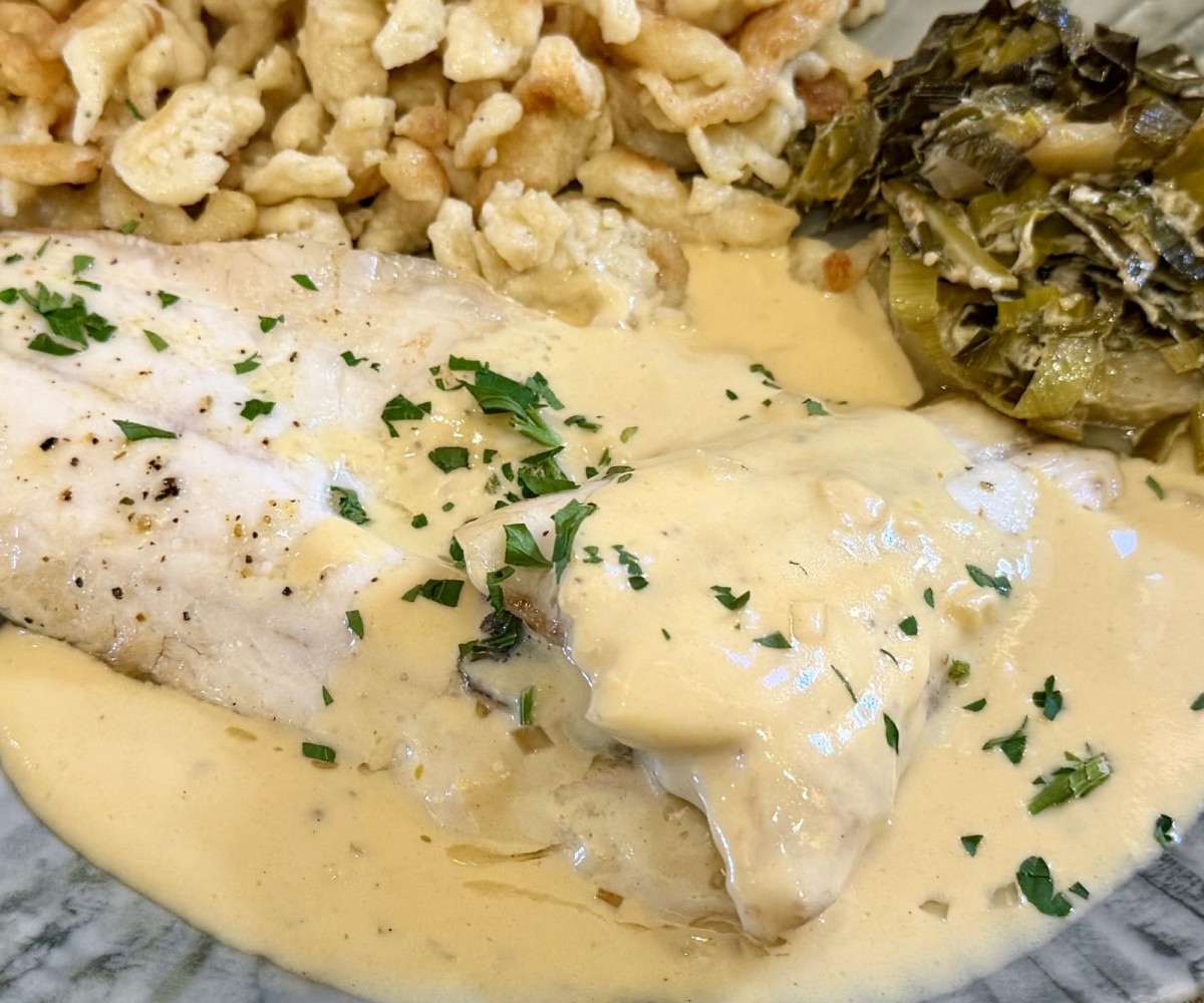 Spaetzles frais, champignons forestiers, crème fraîche, emmenthal, salade.