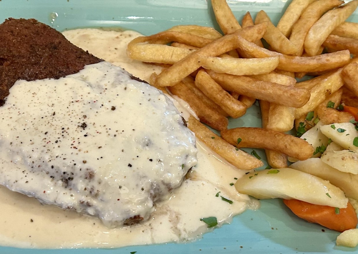 Scaloppina di vitello, prosciutto cotto (origine UE), formaggio Comté, impanatura croccante fatta in casa (circa 400 g). Salsa a scelta: crema di Reblochon o crema di funghi. Servito con verdure di stagione e patatine fritte, spätzle o riso basmati.Tempo di preparazione: 20 min.