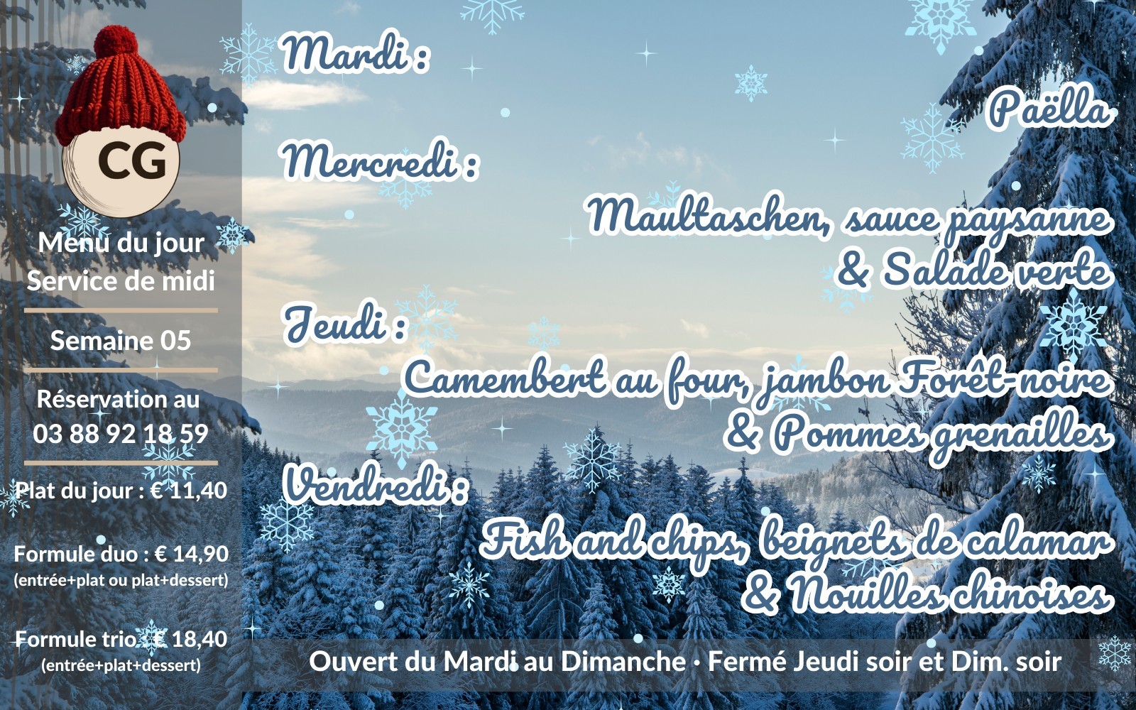 Spätzle freschi fatti in casa, pancetta , cipolle, panna, formaggio raclette, noce moscata. Serviti con insalata e vinaigrette fatta in casa.