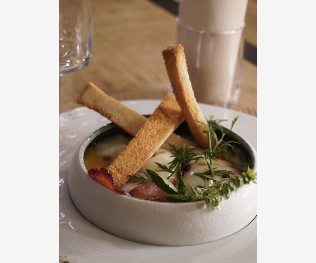 Camembert ripieno di pancetta e cipolle candite, arrostito al forno