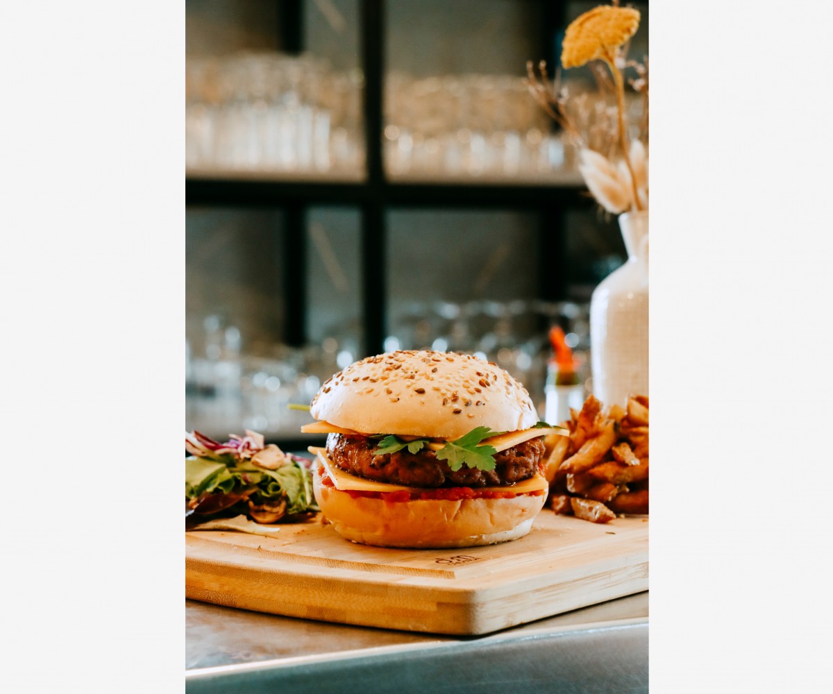 Hamburger, patatine fritte e insalata fatti in casa