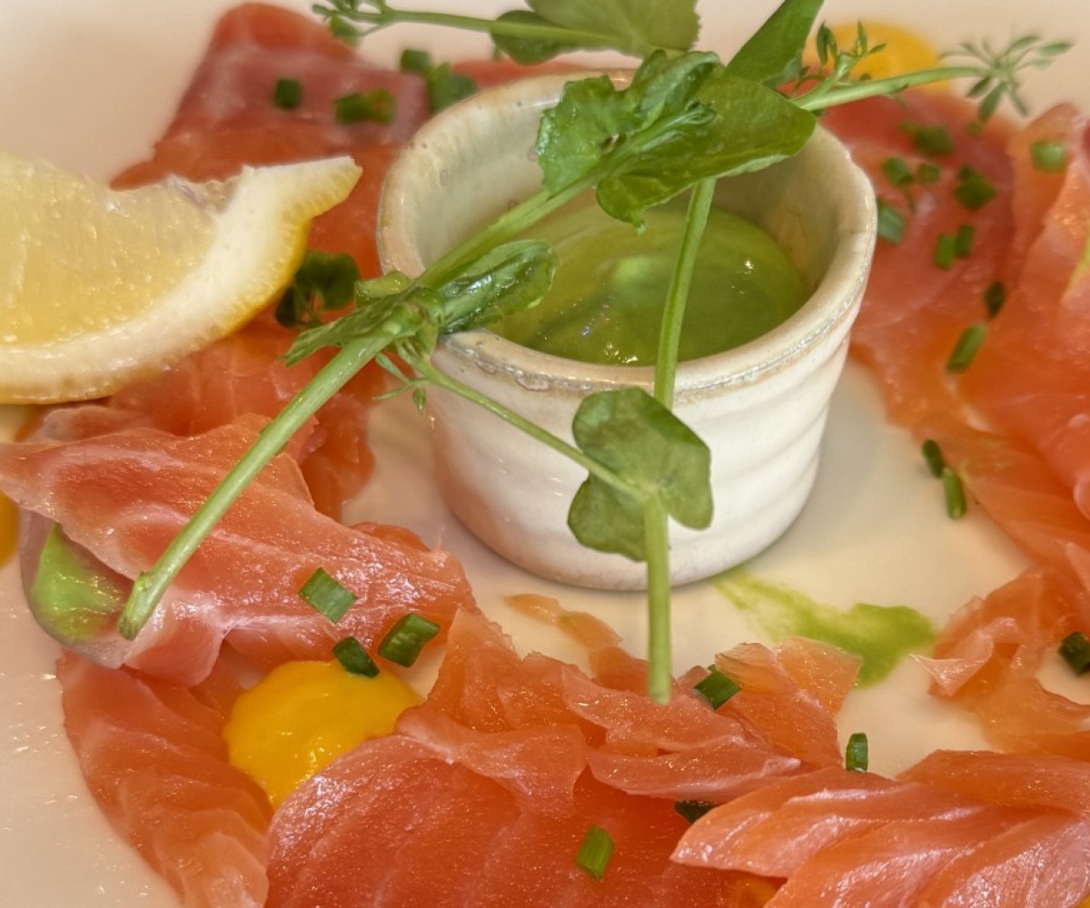 Tranche fine de saumon fumé maison, coulis aux herbes fraîches et citron confit