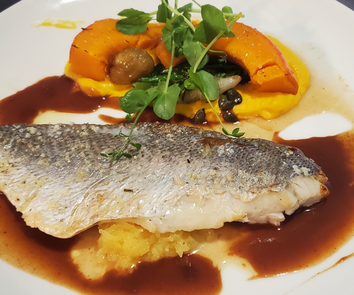 Retour de nos criées, purée à la butternut, légumes d'automne et sauce civet