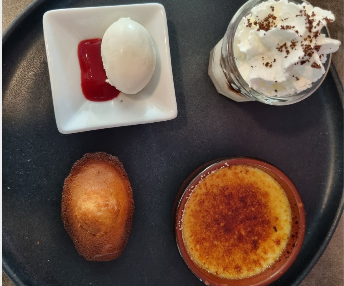 Glace : Vanille, caramel beurre salé et sel de Guérande, café, chocolatSorbet : Framboise, fraise, cassis, citron vert