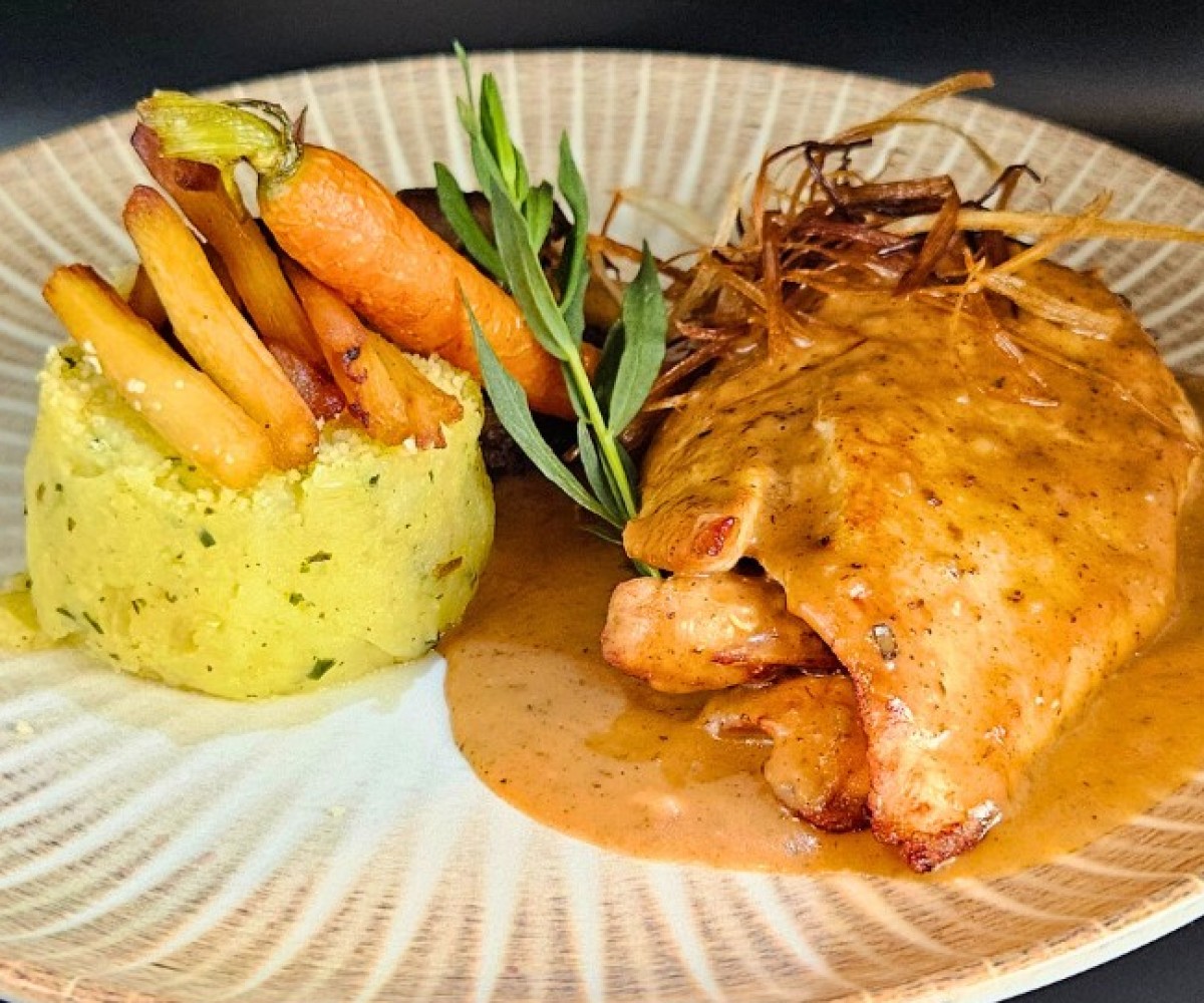 Carottes, pleurotes, châtaignes, écrasé de pommes de terre au beurre demi-sel, salsifis caramélisés.