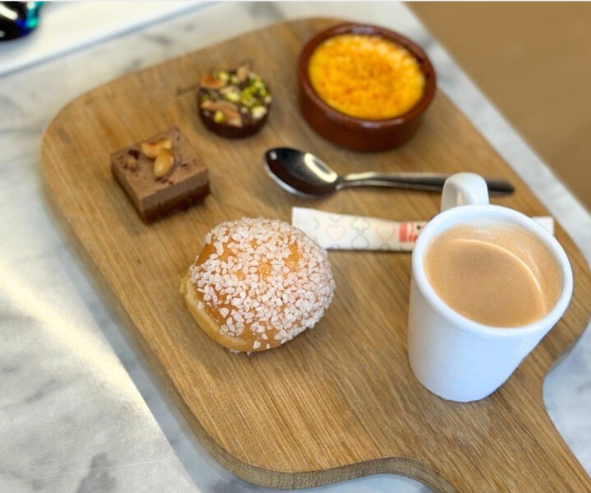 Farandole de mini desserts : Mini tropézienne, Mini carré noisette, Mendiant croustillant chocolat noir, Crème brulée.Photo non contractuelle.