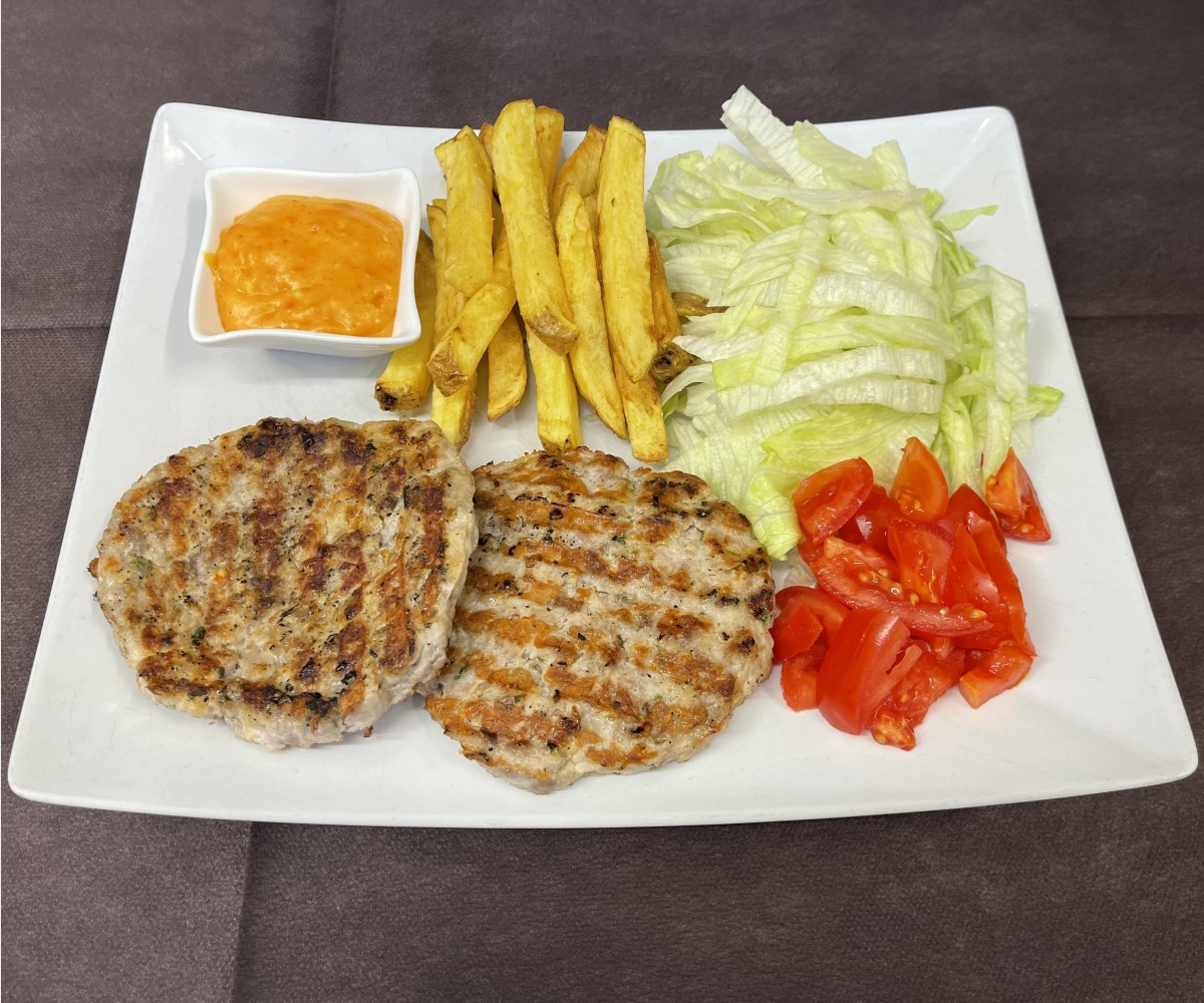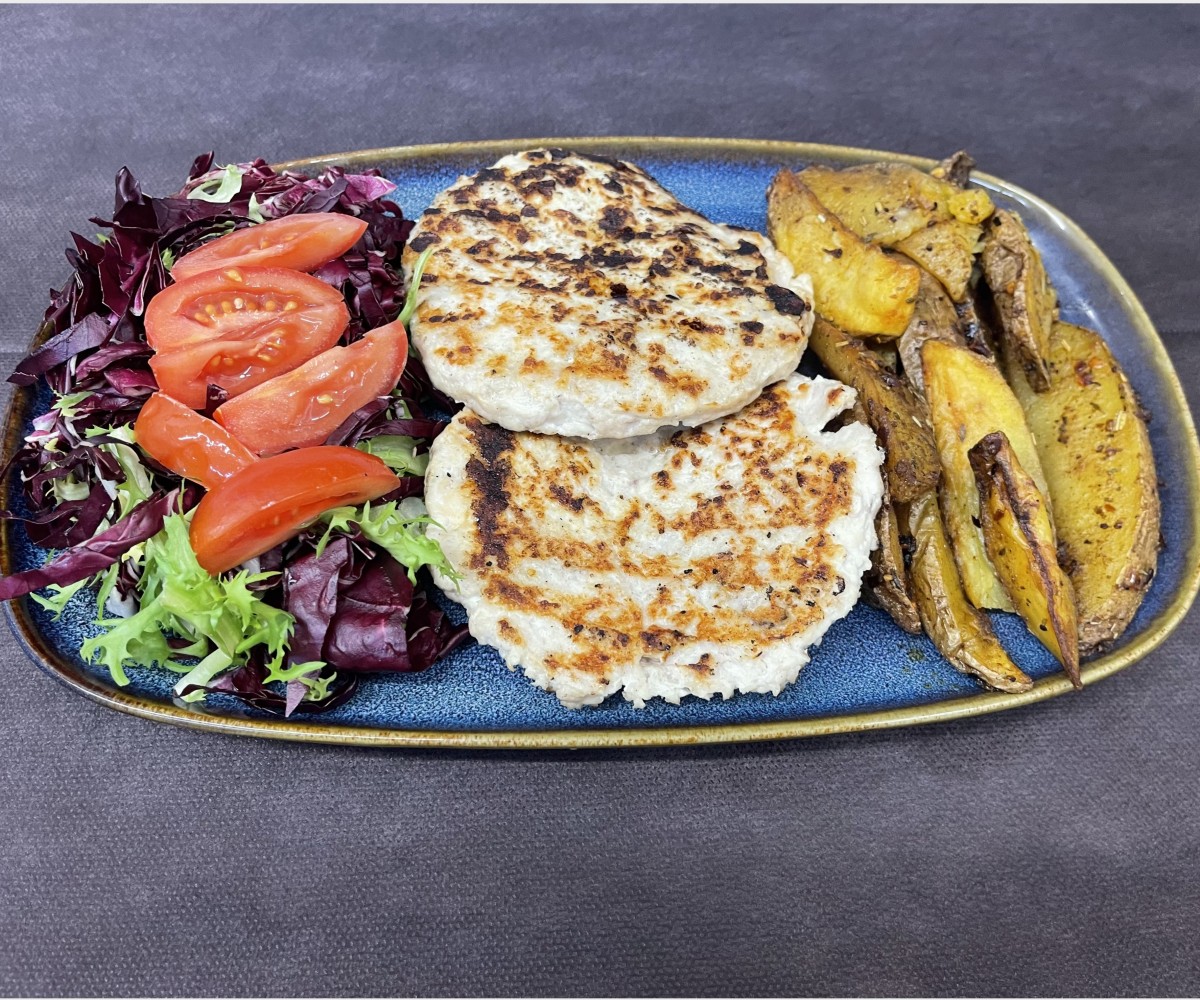 Nr.2 hamburger di pollo freschi lavorati interamente dallo Chef., di circa 155gr. con contorno di pomodorini, insalata mista e patate al forno fresche lavorate interamente da noi