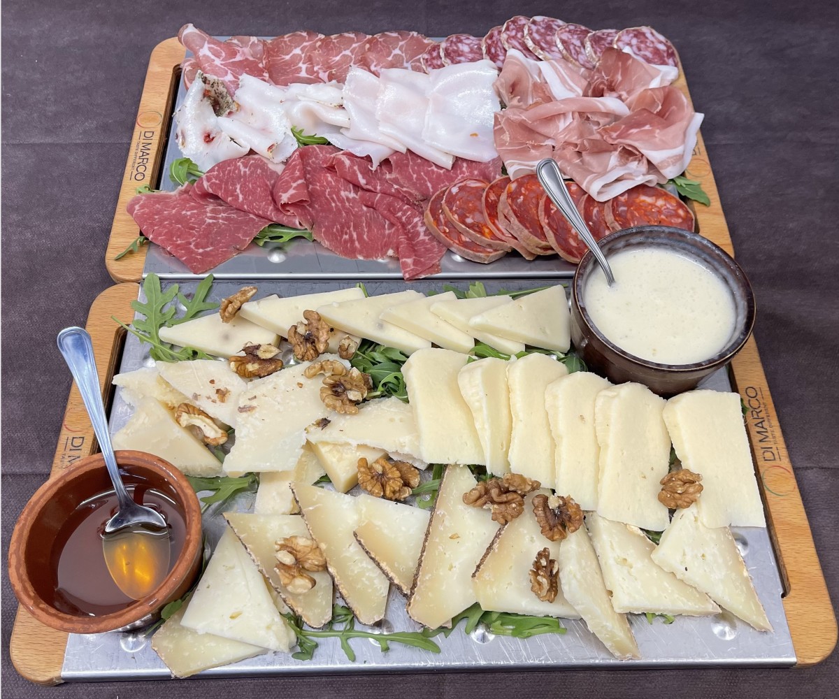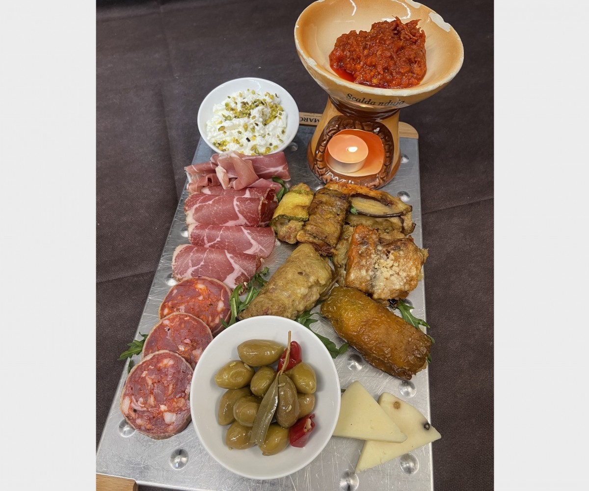 Tutti i prodotti sono lavorati interamente dallo Chef, tagliera composto da parmigiana di melanzane, involtino di peperoni, involtino zucchine, involtino di melanzane, formaggi vaccini e caprini, olive, salame piccante capocollo, fagioli Inferno e 'nduja*I prodotti possono variare in base al periodo con prodotti freschi di stagione