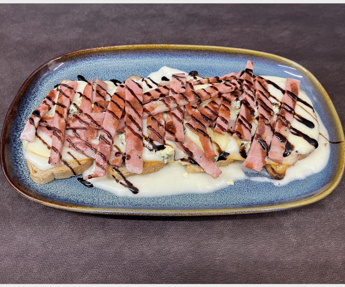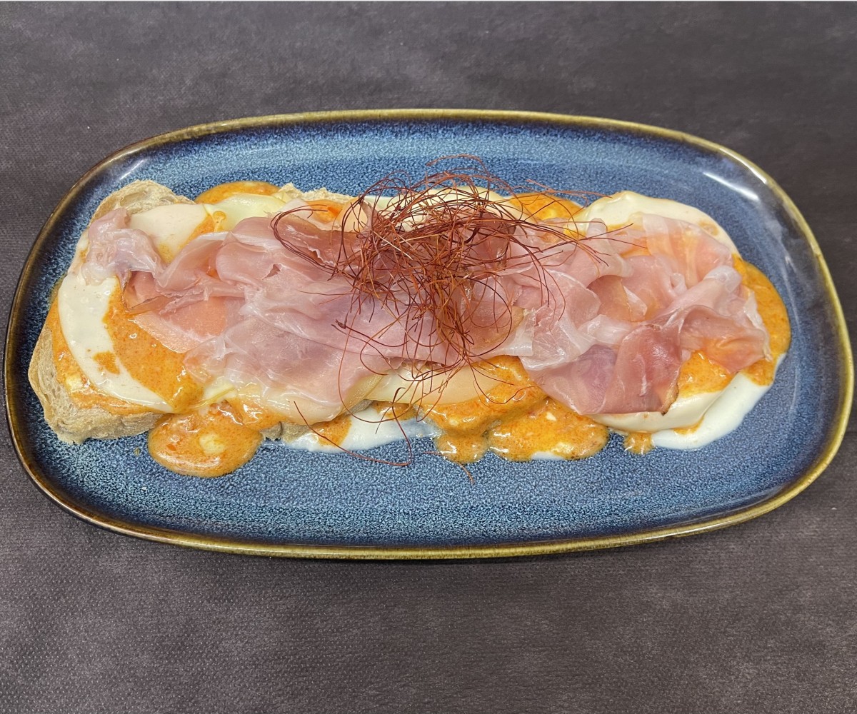 Nr.4 fette di pane fresco con fonduta di formaggi alla 'nduja, prosciutto crudo, scamorza e fili di peperoncino