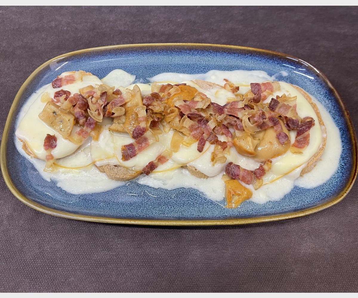 Nr.4 fette di pane fresco con fonduta di formaggi, funghi porcini e guanciale frittoPiadine aperte