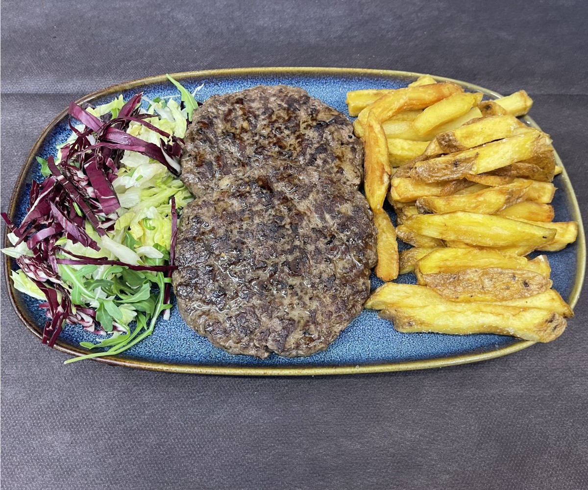 Nr.2 hamburger di vitello freschi lavorati interamente dallo Chef., di circa 155gr., con contorno di insalata mista e patatine fritte fresche lavorate interamente da noi