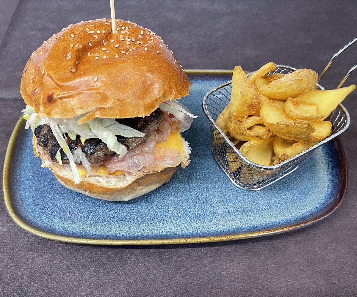 Hamburger di vitello fresco lavorato interamente dallo Chef, di circa 155gr., con pomodoro, insalata riccia, ceddar, speck croccante, ketchup, maionese e contorno di patatine fritte fresche lavorate da noi