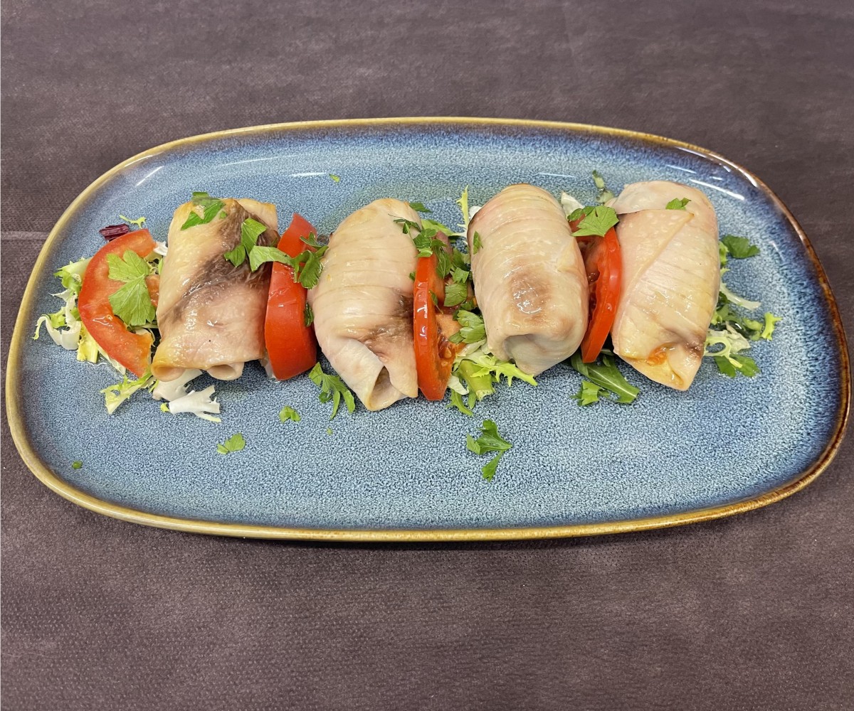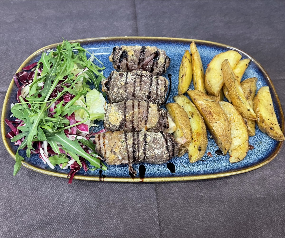 N.4 involtini di carne di vitello freschi lavorati interamente dallo Chef., con contorno di patate al forno e crema ai formaggi