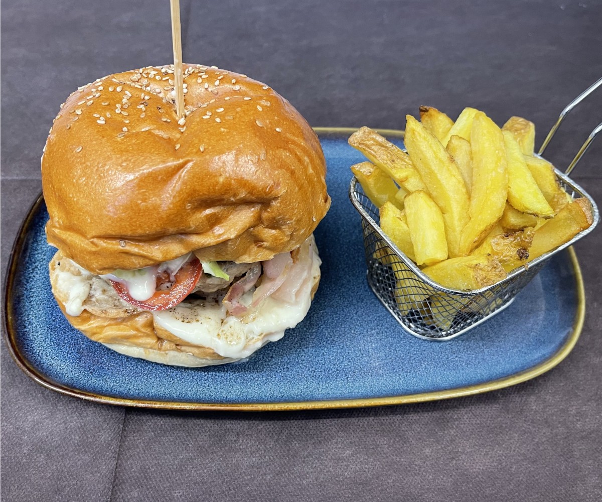 Hamburger di maiale fresco lavorato direttamente dalla Chef, di circa 155gr., con bacon, salsa BBQ, patatine fritte fresche, tabasco, sottiletta, iceberg e funghi champignon