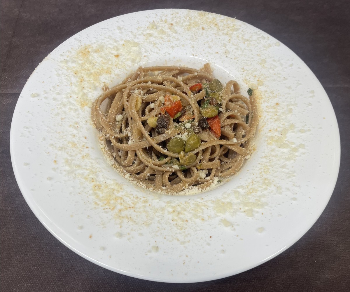 Stroncatura con pomodorini, capperi, peperoncino e uvetta
