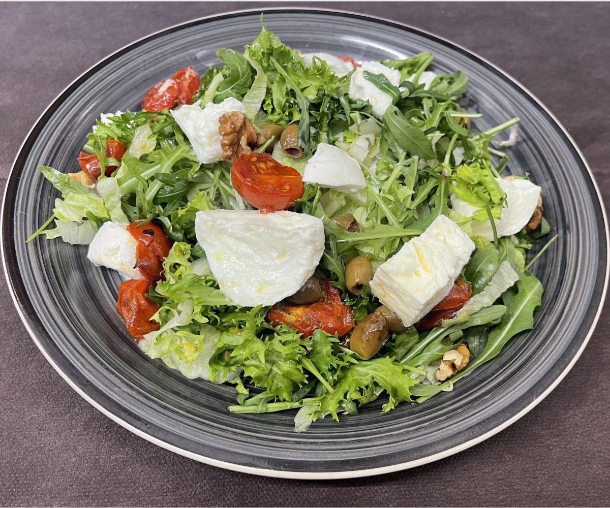 Con insalata mista verde, mozzarella di bufala a cubetti, pomodorini, olive taggiasche e noci