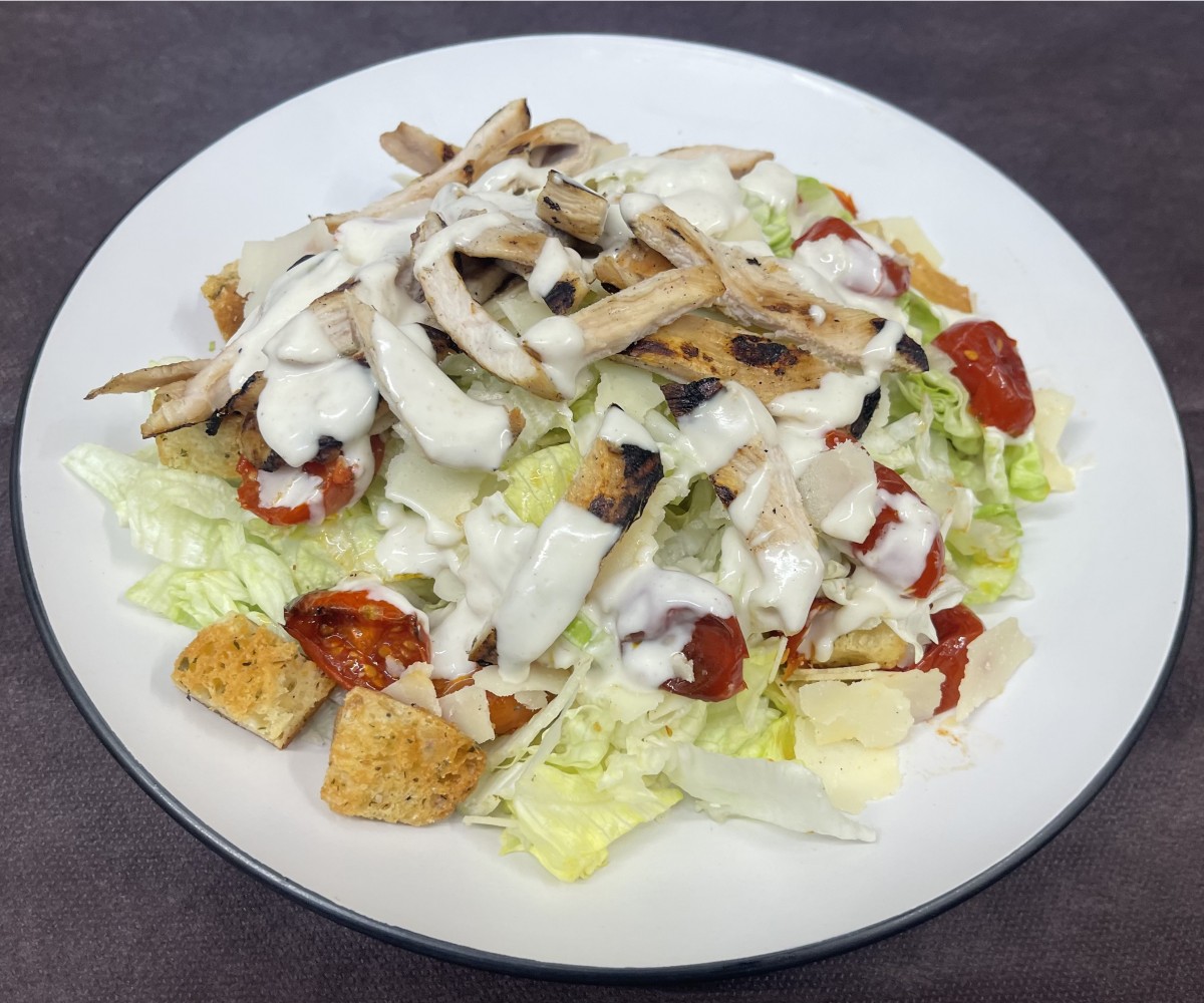 Con iceberg, scaglie di grana, petto di pollo arrosto, crostini di pane, pomodorini e salsa cesar