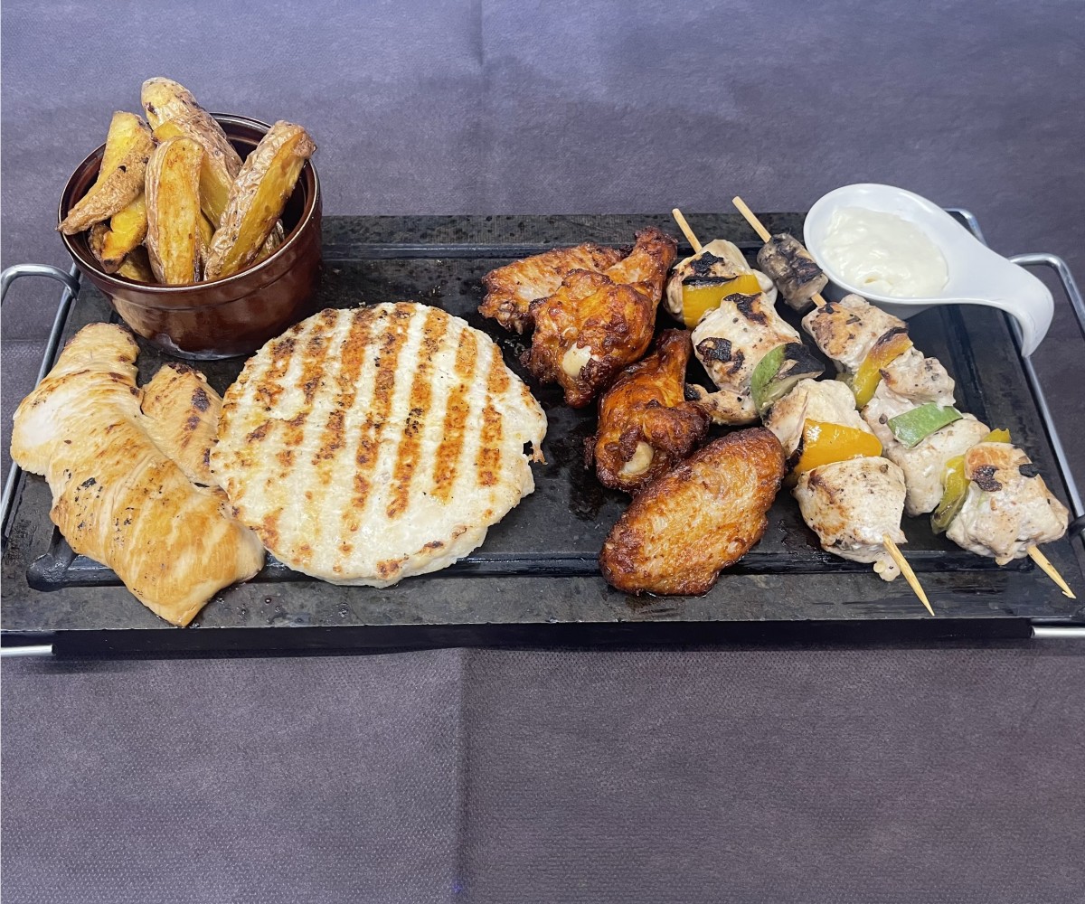 Nr.1 hamburger di pollo fresco, nr.4 alette di pollo e nr.2 spiedoni di pollo, nr.1 fetta di petto di pollo grigliata e contorno di patate al forno fresche lavorate interamente da noi