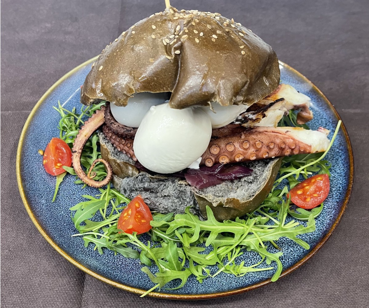Hamburguesa de tinta de calamar con pulpo braseado, cebolla caramelizada, tomates cherry, lechuga iceberg y burrataHamburguesa de cerdo