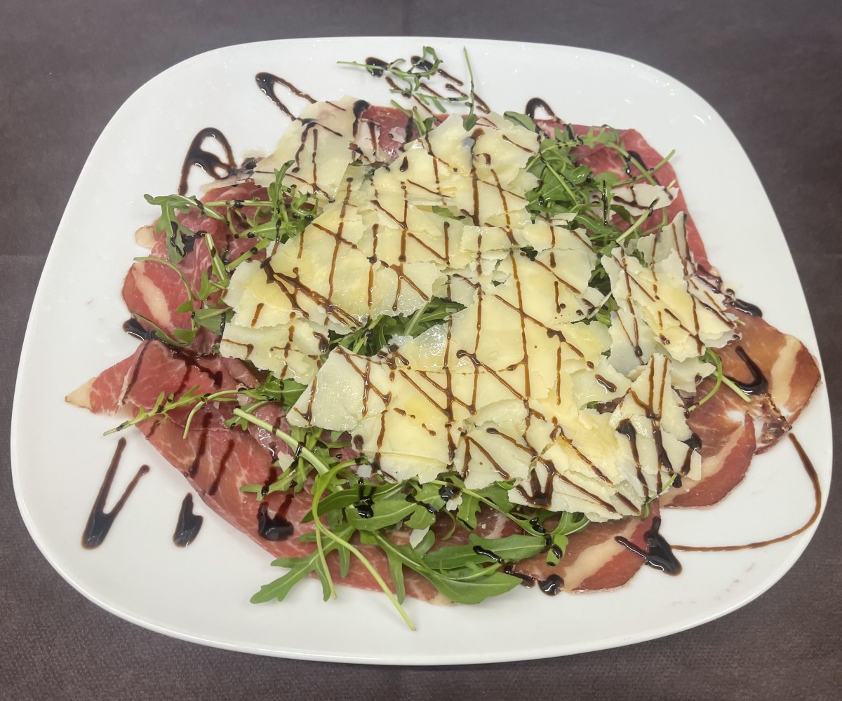 Carpaccio de bresaola servido con parmesano, rúcula y vinagre balsámicoAperitivos de pescado caliente