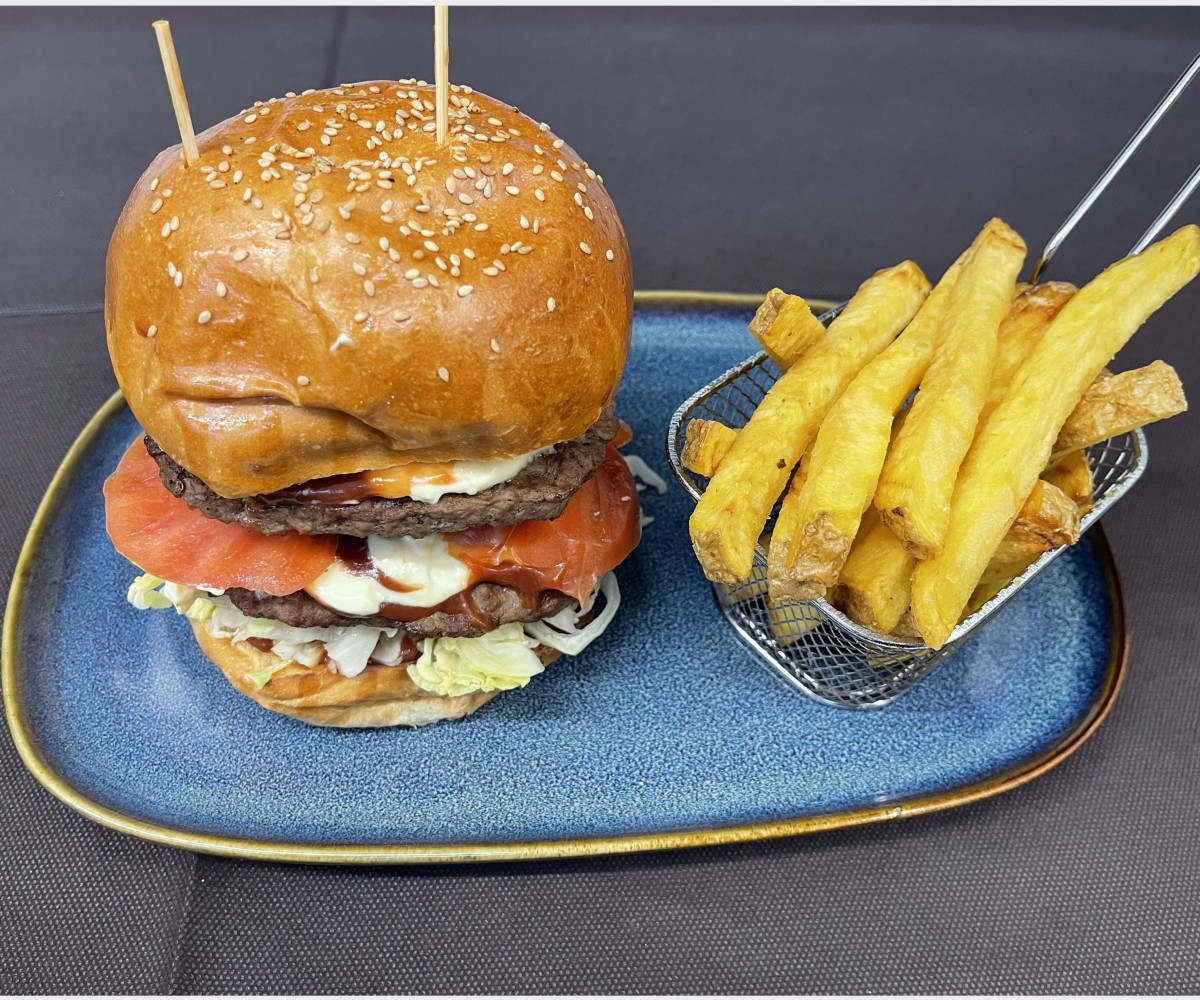 Burger de veau frais préparé entièrement par le Chef, roquette, cèpes, parmesan, sauce au cèdre et aubergines grillées, accompagné de frites maison.