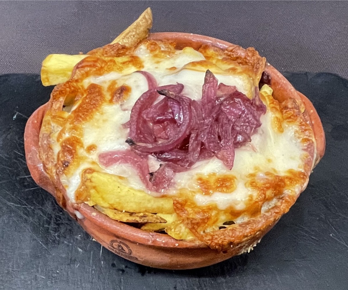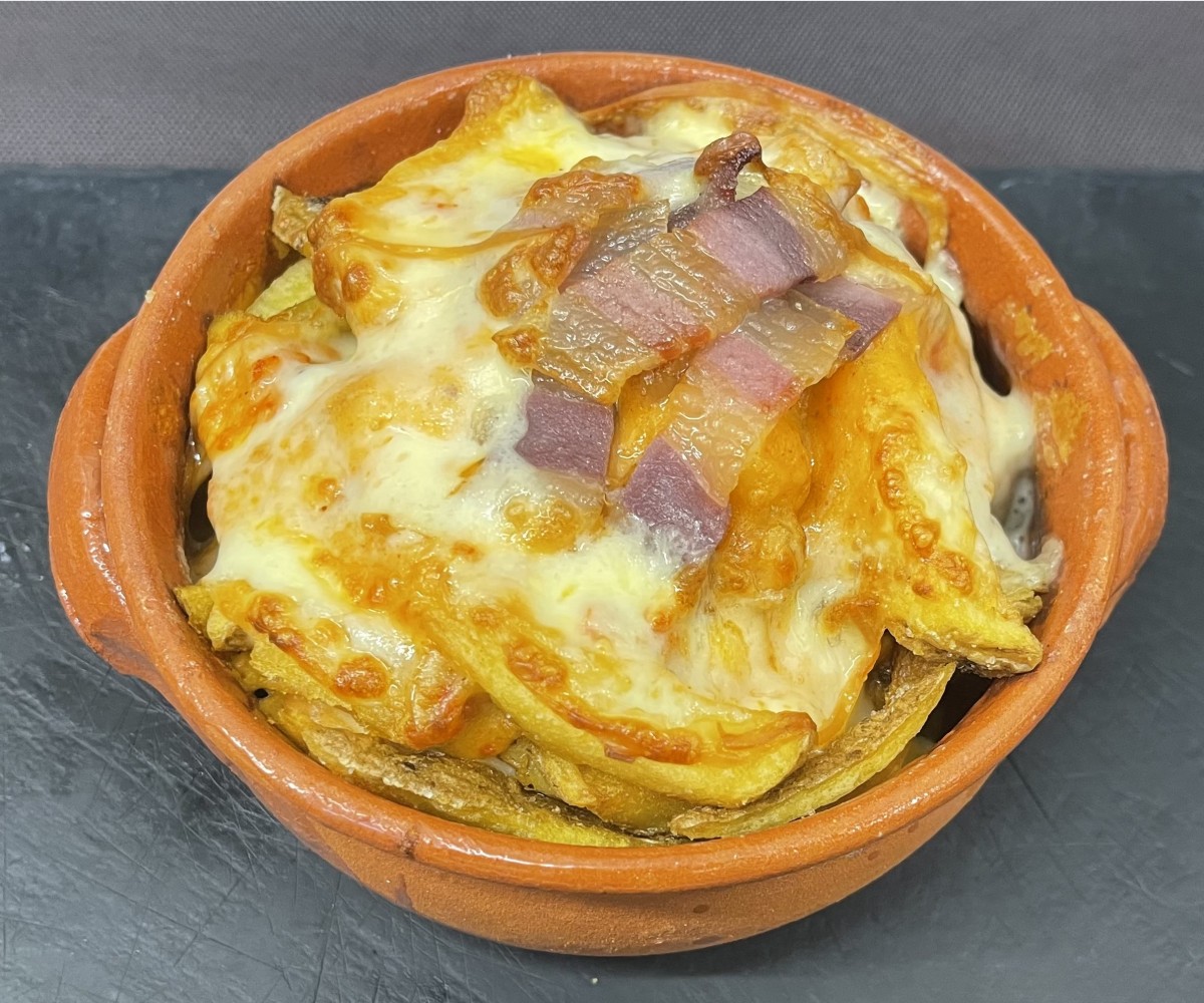 Frites fraîches entièrement faites par nos soins avec du fromage frais, de la scamorza fumée, de l'oignon aigre-doux et du bacon