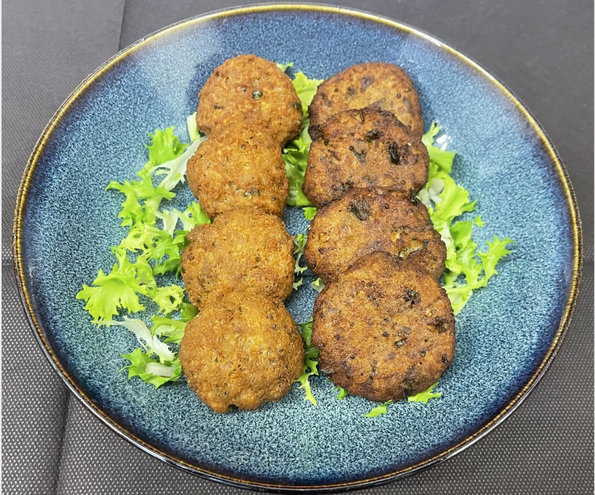 칼치 카포나타, 문어 샐러드, 칼치 파르미지아나, 오징어 미트볼, 카타이피 페이스트리 새우, 빵가루를 곁들인 참치 너겟을 곁들인 혼합 생선 전채 요리*전채요리는 당일 어획량에 따라 달라질 수 있습니다.
