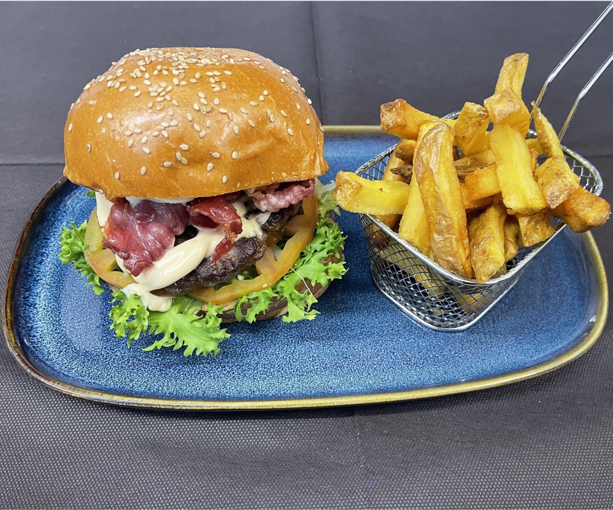 셰프가 직접 만든 신선한 송아지 고기 버거(약 155g)에 케첩, 마요네즈, 그리고 저희가 직접 만든 신선한 감자튀김을 곁들였습니다.13.00 €