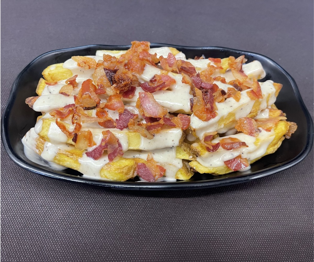 셰프가 직접 만든 신선한 송아지 고기 버거에 토마토, 양상추, 체다 치즈, 바삭한 스펙(훈제 햄), 케첩, 마요네즈를 곁들이고, 저희가 직접 만든 신선한 감자튀김을 함께 제공합니다.