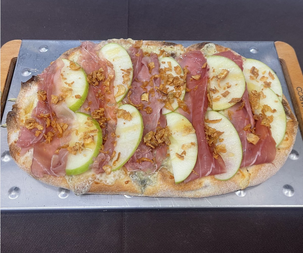 Base branca com gorgonzola, mussarela, speck e maçã.Verduras, mel e cebola frita