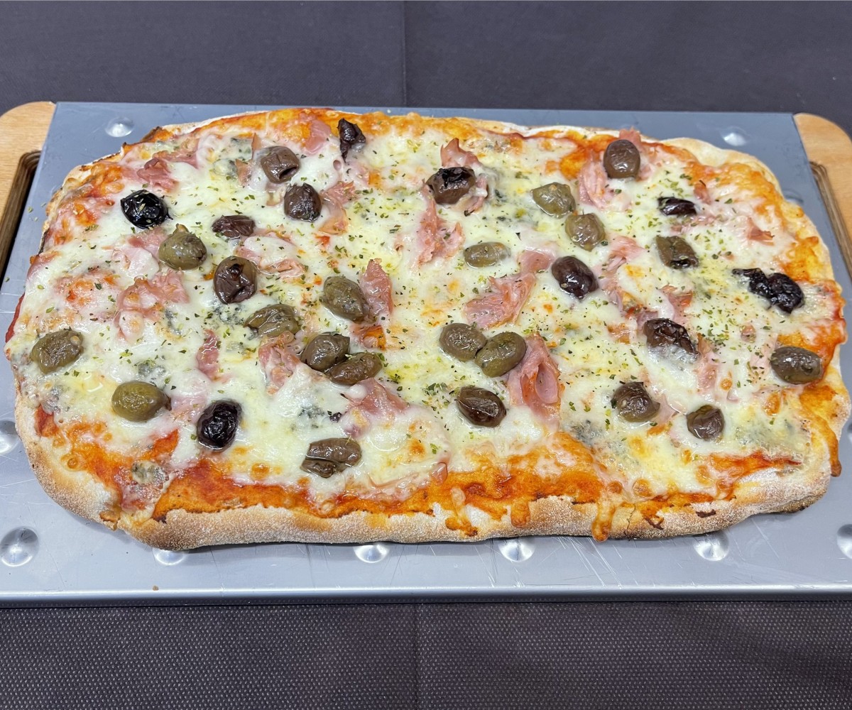 Base vermelha com gorgonzola, mussarela, presunto cozido, azeitonas Taggiasca e orégano.