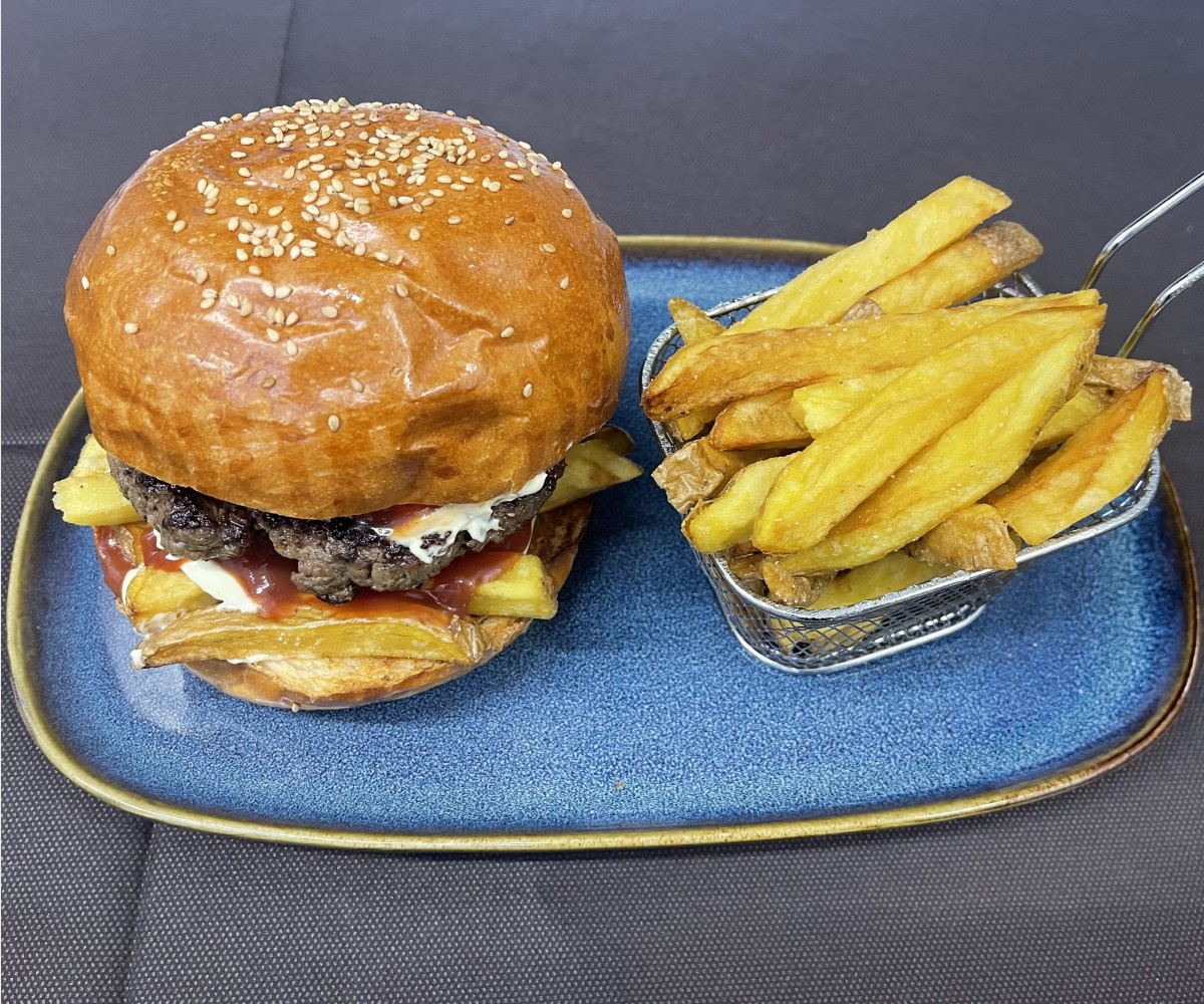 Hambúrguer de vitela fresca, feito inteiramente pelo Chef, com tomate, alface, queijo cheddar, speck crocante, ketchup, maionese e uma porção de batatas fritas frescas feitas por nós.