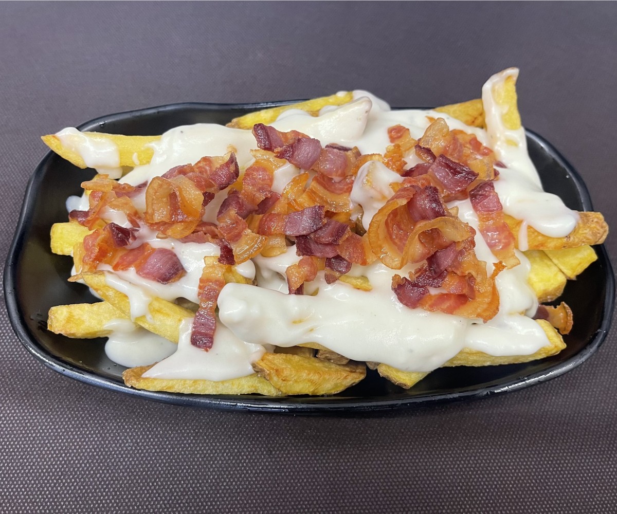 Batatas fritas frescas, feitas inteiramente por nós, com creme de cacio e pepe e bacon crocante.