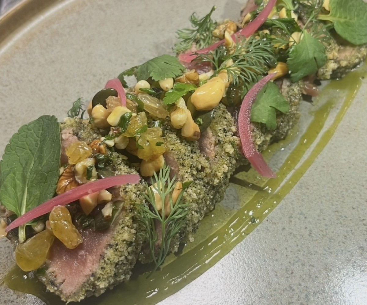 Tataki de thon frit, pané panko et nori, sauce vierge (fruits sec), jus vert et herbes fraiches