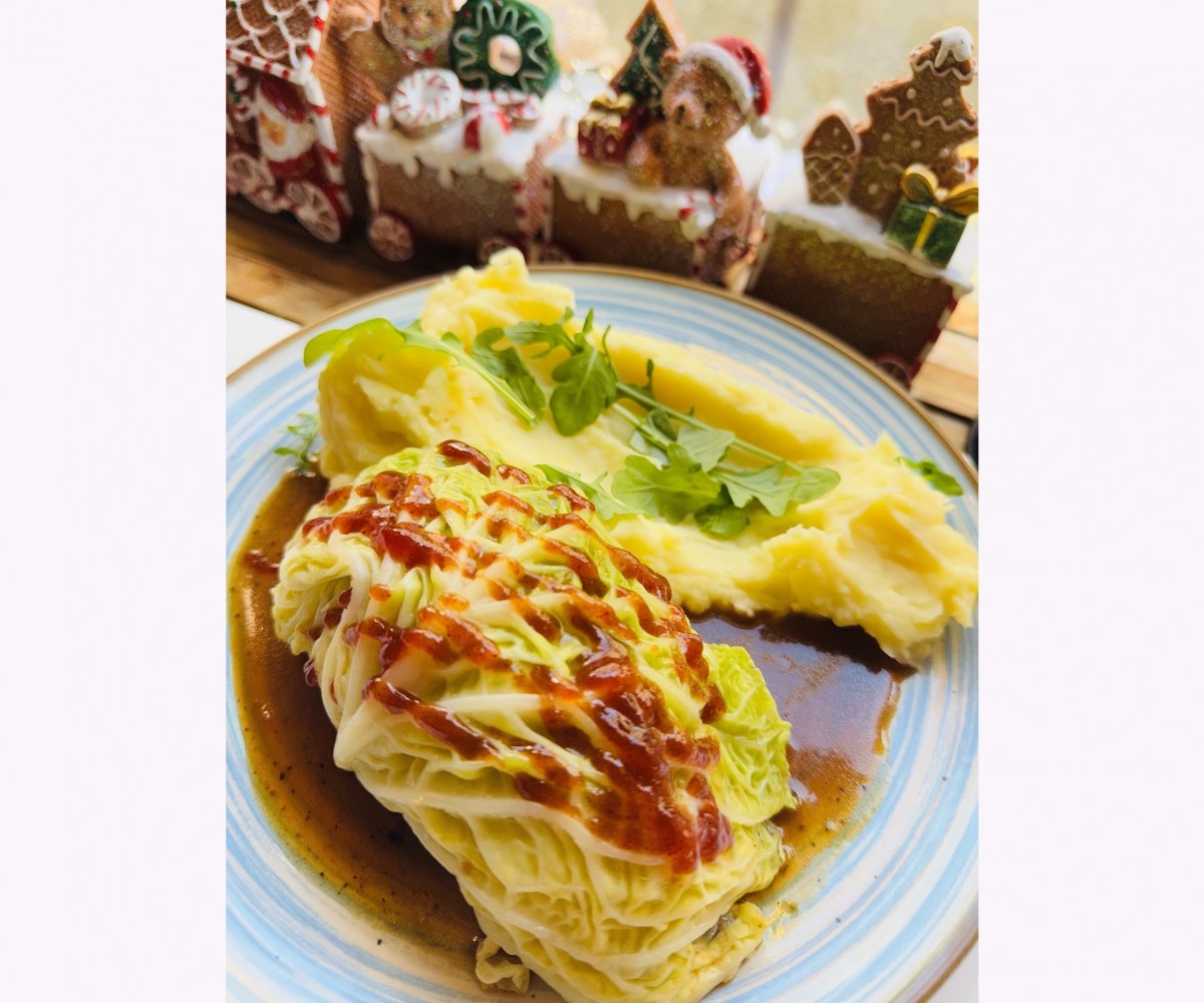 Boeuf Charolais (env. 260g), jus bourguignon, sauce moutarde ancienne façon Imprévu, confiture d'oignons à la bières brune et Cheddar fumé maison.