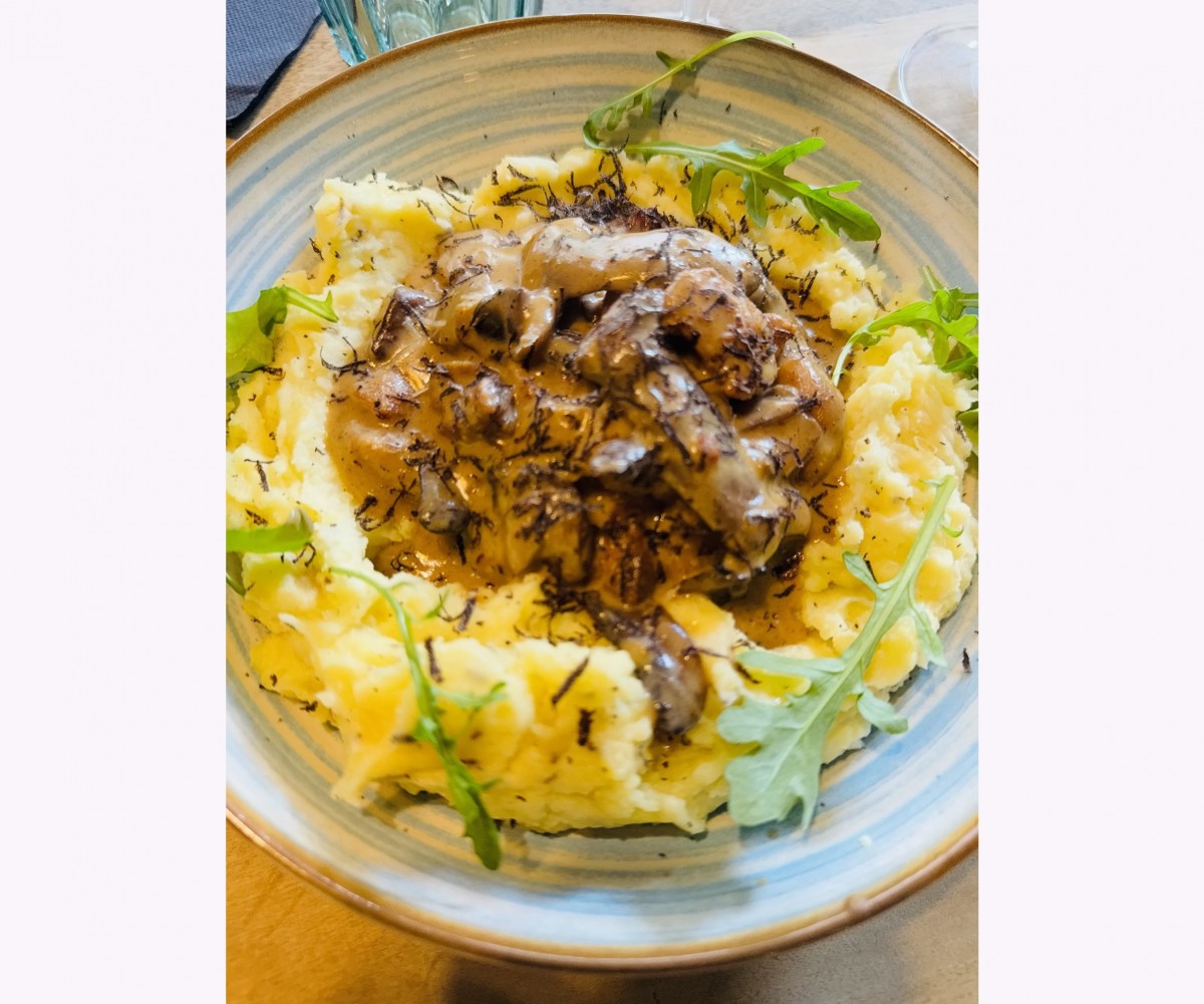 (Race à viande, Montbéliard, Charolais ou Blonde d'Aquitaine, env. 500G)Poivre concassé, flambée à l’Armagnac, sauce crème, cèpes, girolles, pleurotes, frites maison et salade.