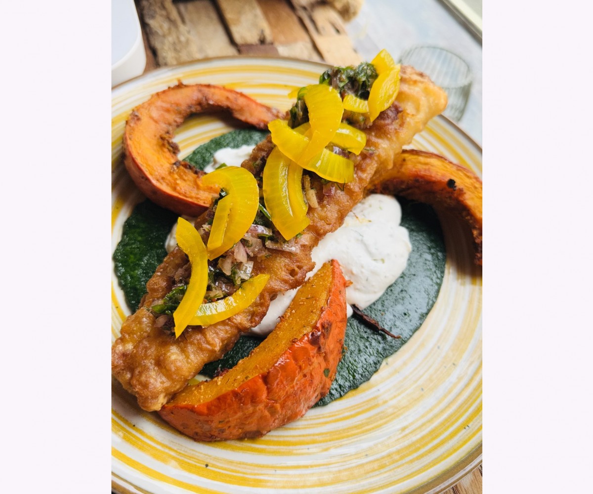 Filet de cabillaud pané à l'anglais crêpe épinards crème ricotta citron yuzu herbesl